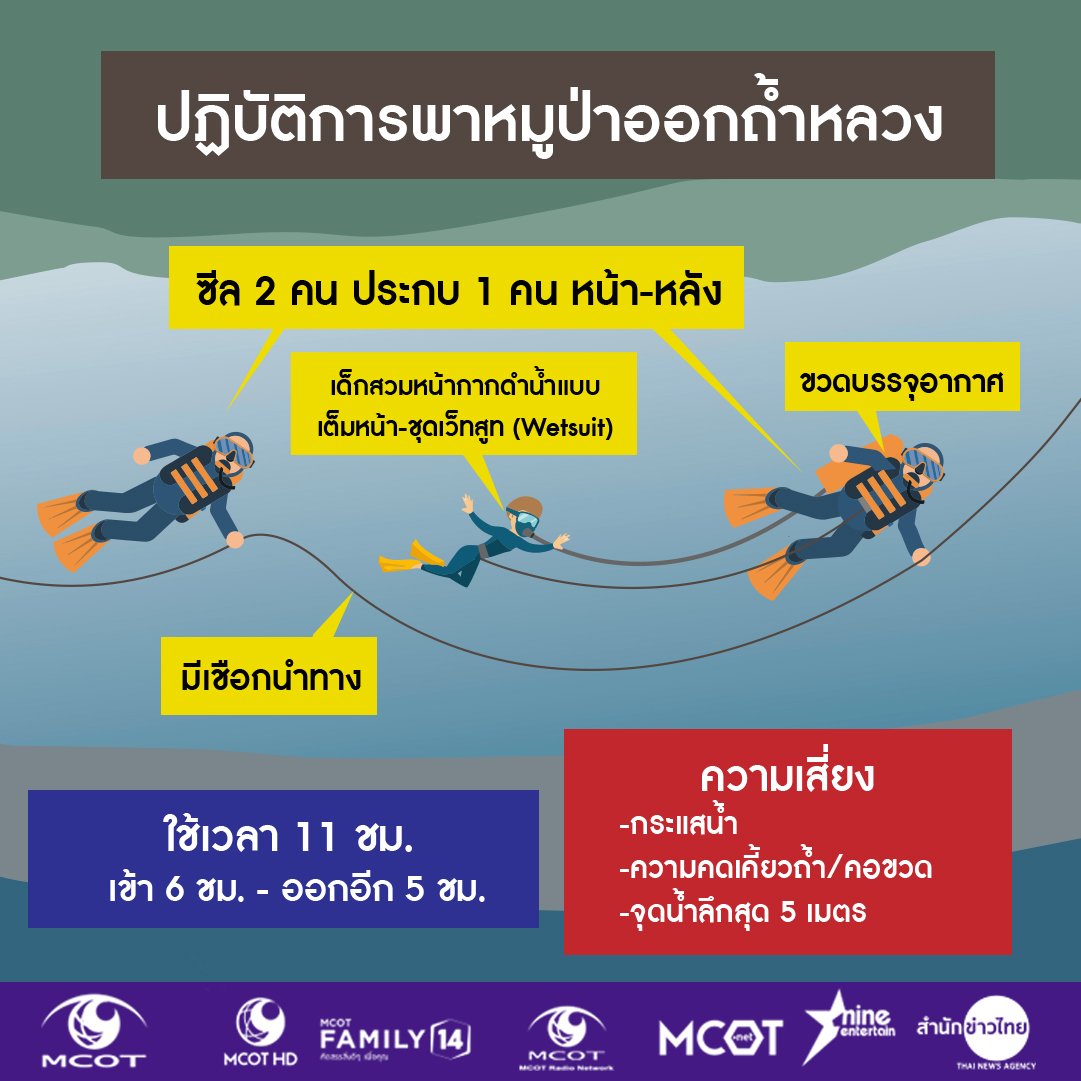 Ahogy arról korábban beszámoltunk, oxigénhiányos környezetben, merüléssel kell kijutniuk a bennrekedteknek a barlangból. A BBC információi szerint a gyerekek légzőmaszkot és légzőpalackot viselve kerülnek kimentésre, fokozatosan. Minden gyereket két búvár kísér, kötéllel egymáshoz kötve, mert a barlangban több veszélyes és szűk forduló is található, amelyek víz alatt vannak. Erről bővebben itt számoltunk be: