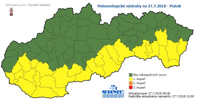 A Szlovák Hidrometeorológiai Intézet (SHMÚ) péntekre egész Dél-Szlovákia területére elsőfokú hőségriadót rendelt el. Több járásban 33 fok fölé is emelkedhet a hőmérséklet.