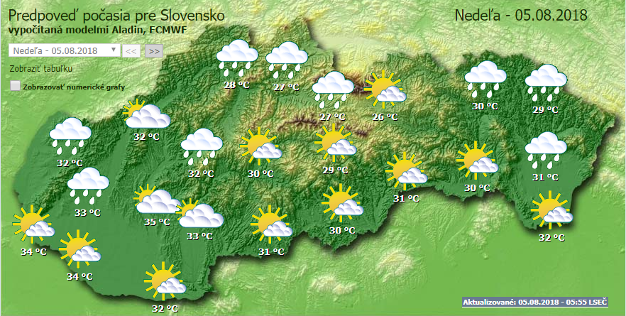 A hét utolsó napján is sok napsütésre számíthatunk, továbbra is marad a tikkasztó hőség. A nap folyamán az ország több területén alakulhat ki zápor, zivatar. A legmagasabb nappali hőmérséklet 29 és 34 Celsius-fok között alakul, míg a Zsolnai kerületben, Szepességben és Felső-Garam mentén 24 és 29 Celsius-fok közötti értékeket mérhetünk. A hegyekben, 1500 méteres magasságban 19 fok lesz. A gyenge déli-délnyugati szél (20 km/h) délután nyugat felől északi-északnyugati széllé alakul át.
