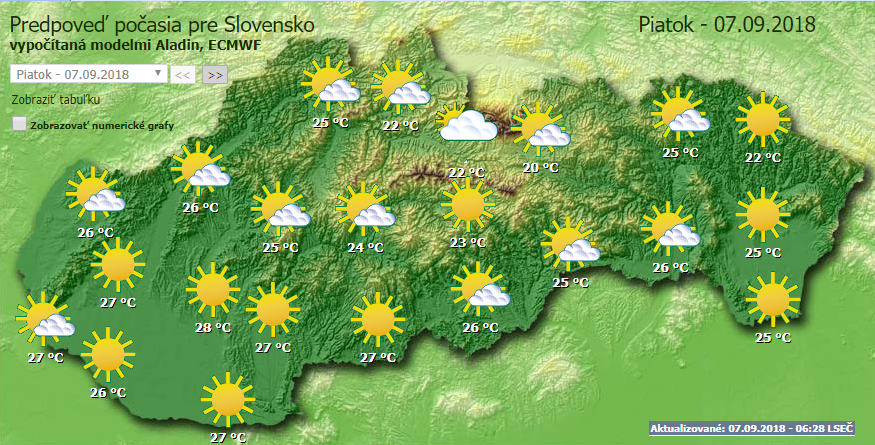 Pénteken is marad a többórás napsütés, csak helyenként növekedhet meg a felhőzet. A reggeli és a délelőtti órákban az alacsonyabban fekvő vidékeken köd kialakulására lehet számítani. Délután elszórtan záporok, zivatarok és viharok alakulhatnak ki. A legmagasabb nappali hőmérséklet 23 és 28 fok között alakul, míg Árván és a Tátra alatt 19 és 23 fokot mérhetünk. Gyenge lesz a légmozgás, csupán az ország délkeleti részén erősödhet meg az északi szél (20 km/óra).
