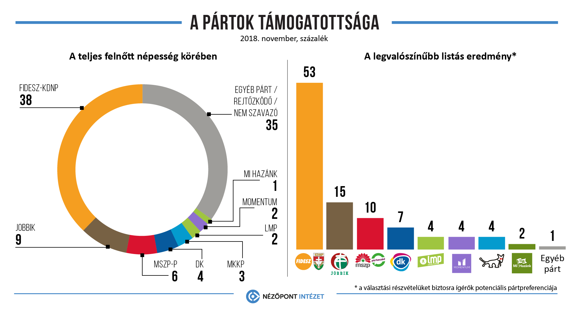 A Jobbik fordított utat járt be, támogatottsága októberről novemberre 17-ről 15 százalékra csökkent. Utóbbi a leggyengébb adat, 4 százalékpontos esés az áprilisi országgyűlési választás óta, miközben a belőle kivált Mi Hazánk 2 százalékra növelte szavazói arányát. Az MSZP-P megtartotta múlt havi, 10 százalékos táborát, a DK 1 százalékpontot veszítve ezúttal 7 százalékot szerezne. Továbbra is egyaránt 4-4 százalékon áll az LMP, a Kutyapárt és a Momentum, 1 százalék pedig egyéb pártokra szavazna.