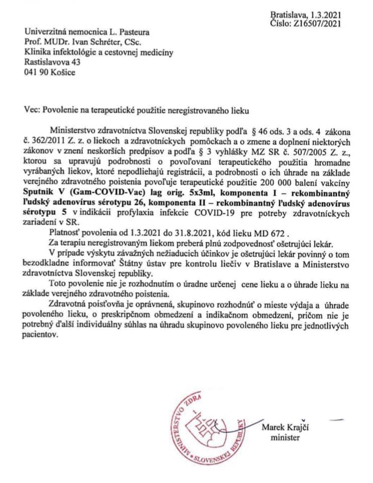 Szlovákia engedélyezte a Szputnyik V nevű orosz vakcina lakossági felhasználását. Az oltóanyag Marek Krajči (OĽaNO) egészségügyi miniszter egyéni kivételével kapott jóváhagyást.