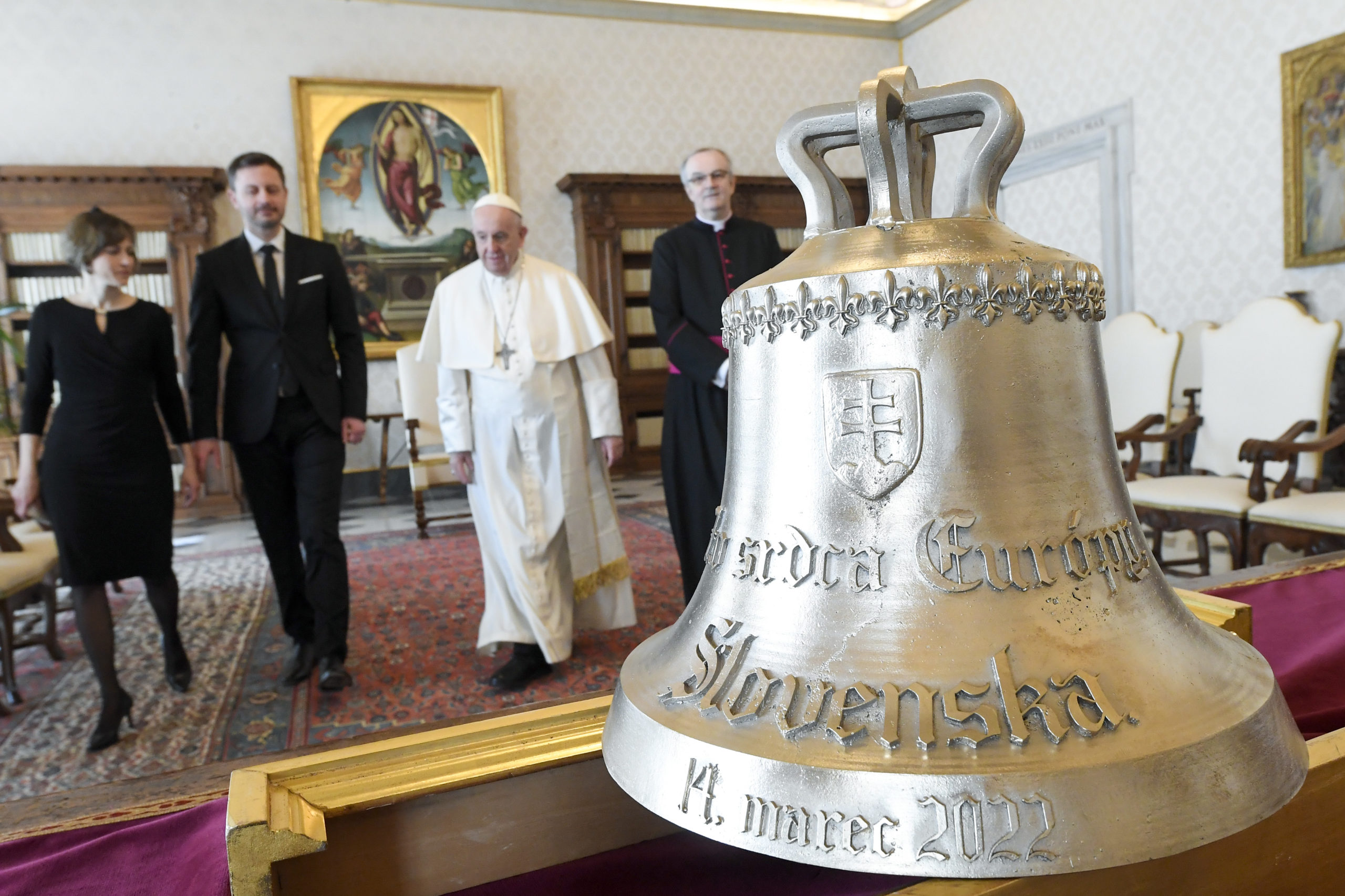 A szlovák miniszterelnök mai találkozóján a Vatikánban egy bronzból öntött harangot ajándékozott a Szentatyának, melyen Cyril és Metód hittérítők láthatók.