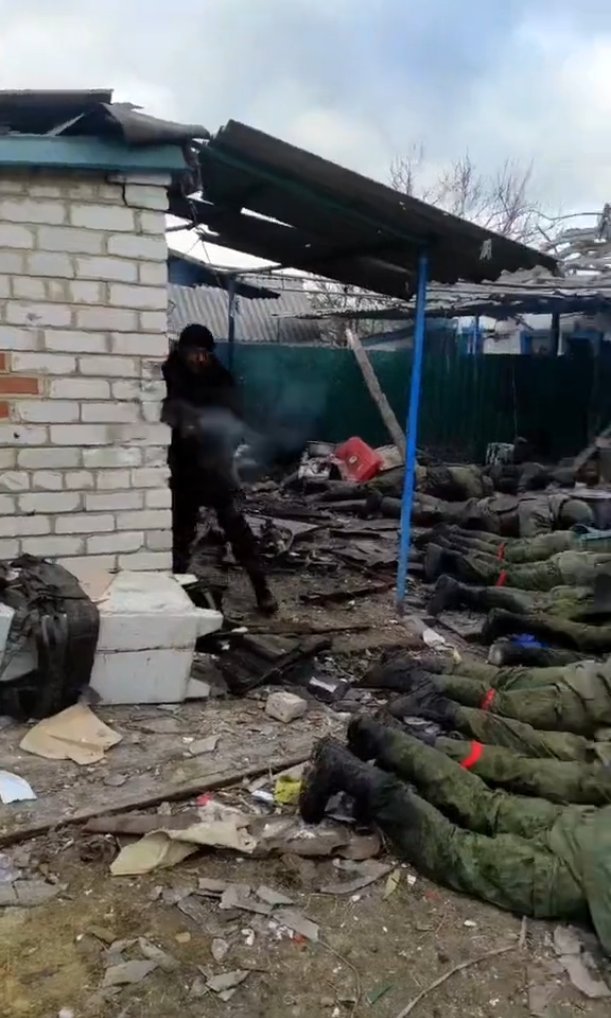 Körkép.sk megjegyzése: a felvételen, amelyet brutalitása miatt nem mutatunk be, az látszik, hogy egy katona (lásd a képet) tüzet nyit, mire a videózó ukrán rángatni kezdi a kamerát. Ezt követően lövések dördülnek. A twitteres hozzászólások szerint a „fekete” alak egy orosz katona, de akár egy ukrán is lehet, aki épp agyonlövi a földön fekvő foglyokat.