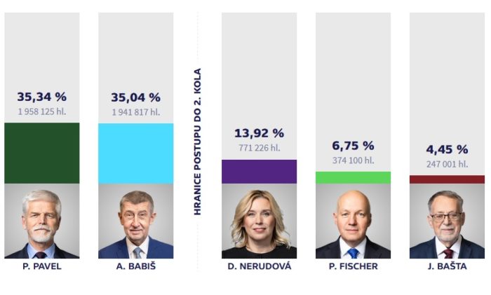 A szavazatok 90 százalékának összeszámlálása után Babiš a szavazatok hozzávetőleg 35,6 százalékát szerezte meg. Őt szorosan követi Pavel, aki a szavazók csaknem 34,8 százalékát kapta a Cseh Statisztikai Hivatal által közzétett előzetes eredmények szerint. A szavazatok csaknem 99 százalékának összeszámlálása után már Petr Pavel mutatták az elnökválasztás első fordulójának győztesének. Ezzel megelőzte a választásokon eddig vezető Andrej Babišt.