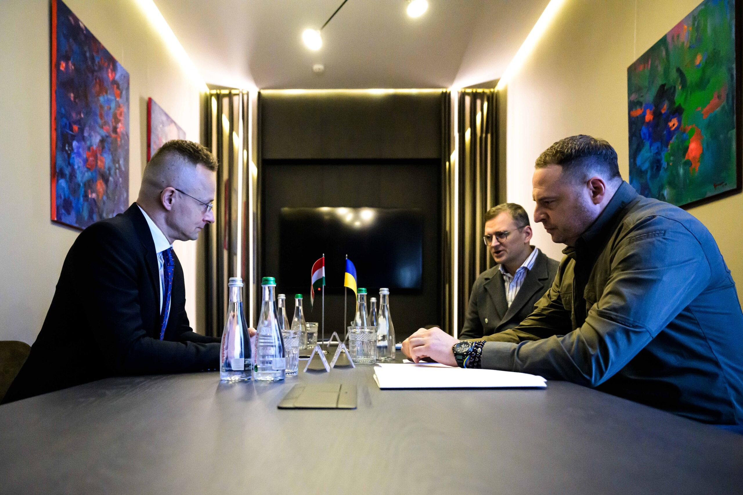 A Külgazdasági és Külügyminisztérium (KKM) által közreadott képen Szijjártó Péter külgazdasági és külügyminiszter (b), Andrij Jermak, az ukrán elnöki hivatal vezetõje (j) és Dmitro Kuleba ukrán külügyminiszter (j2) tárgyalása Ungváron 2024. január 29-én.