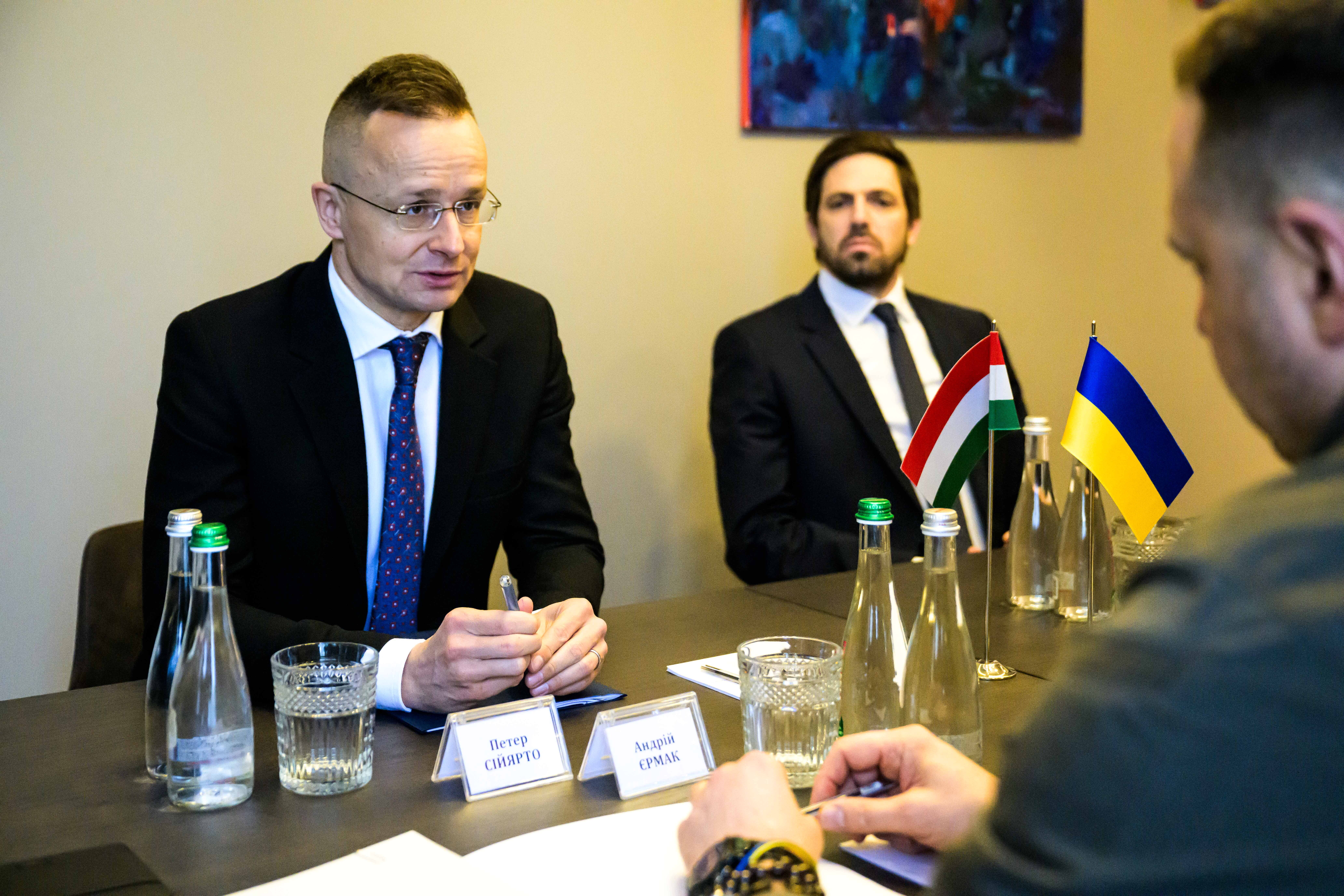 A Külgazdasági és Külügyminisztérium (KKM) által közreadott képen Szijjártó Péter külgazdasági és külügyminiszter (b), mellette Magyar Levente, a Külgazdasági és Külügyminisztérium parlamenti államtitkára (j) és Andrij Jermak, az ukrán elnöki hivatal vezetõje (elöl) Ungváron, ahol Szijjártó Péter tárgyalt Dmitro Kuleba ukrán külügyminiszterrel 2024. január 29-én.