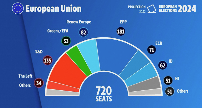 Az Európai Parlamentben az eddig rendelkezésre álló exit pollok és előrejelzések szerint a jelenleg is domináns Európai Néppárt (EPP), a Szocialisták és Demokraták Progresszív Szövetsége (S&D) és az Újítsuk meg Európát (Renew Europe) nagykoalíciója maradhat a vezető erő, mivel 398 képviselőjük lehet a 720-ból.