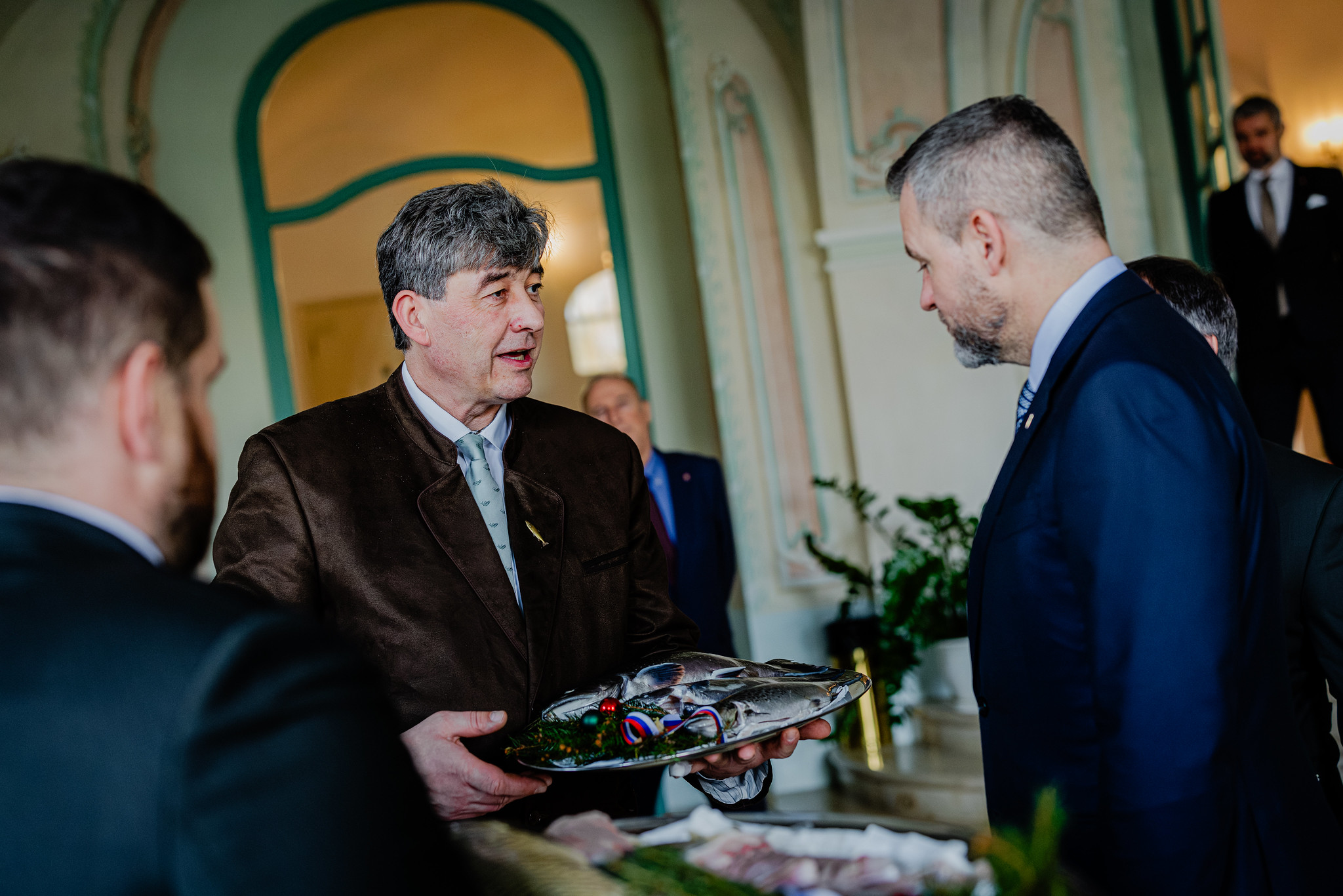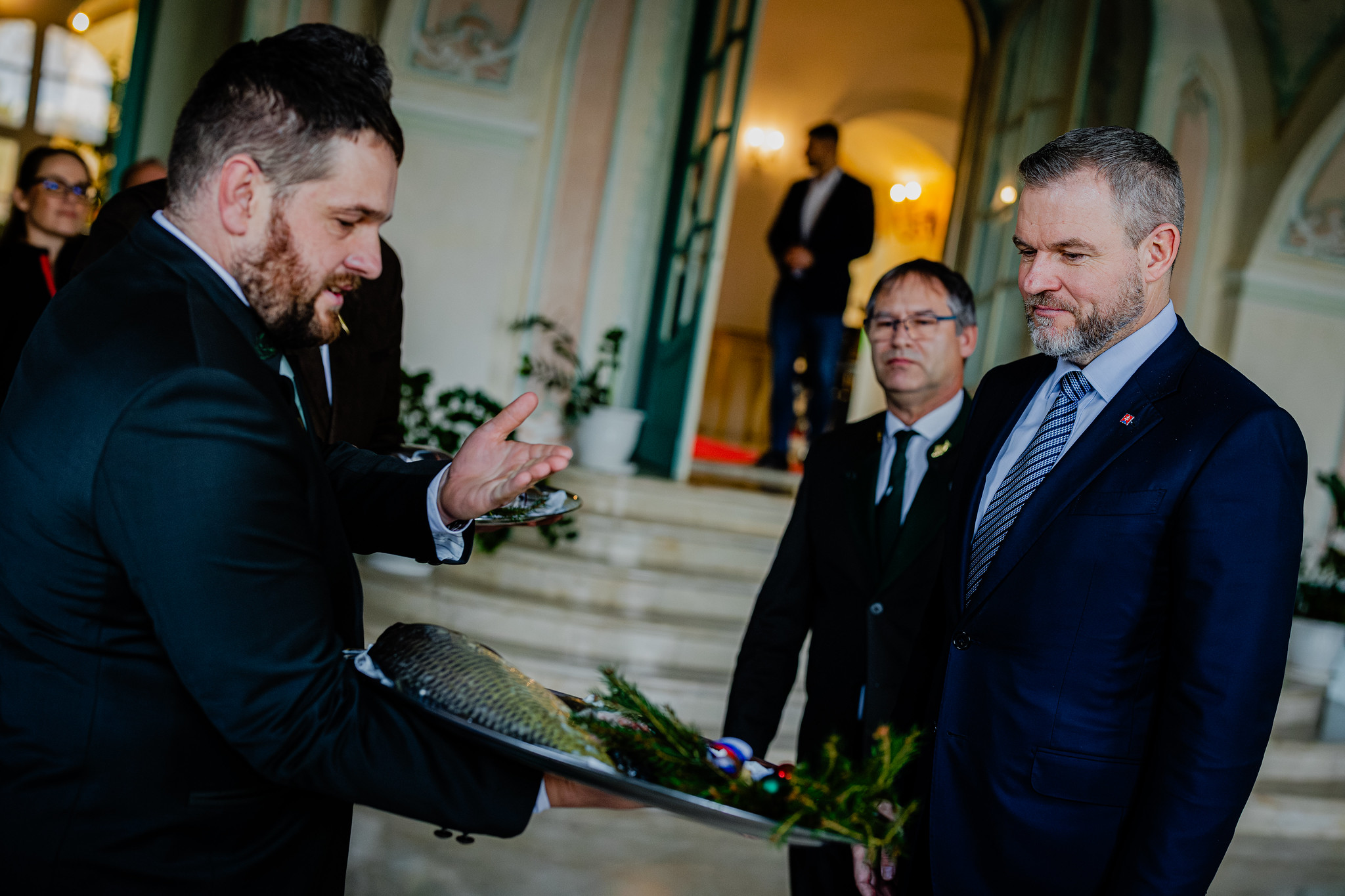 A Szlovákiai Haltenyésztők Szövetségének (SCHRS) képviselői ma az elnöki palotában jelképesen karácsonyi pontyot adtak át Petr Pellegrini államfőnek. Az „elnöki” ponty eredete Gömör vidékére nyúlik vissza, ahol a tavak ideális környezetet biztosítanak ennek a hagyományos halnak az ünnepi asztalra való felneveléséhez.