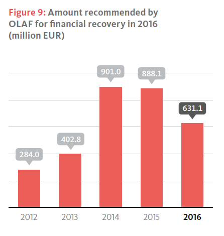 Az OLAF 2016-ban 272 vizsgálatot zárt le, 2016-ban összesen 661 millió eurót követelt vissza a tagállamoktól szabálysértések és csalások miatt. A tendencia egyébként csökkenő, 2015-ben még 888 milliót követeltek vissza a tagállamoktól, de például 2013-ban „csak” 402 milliót.