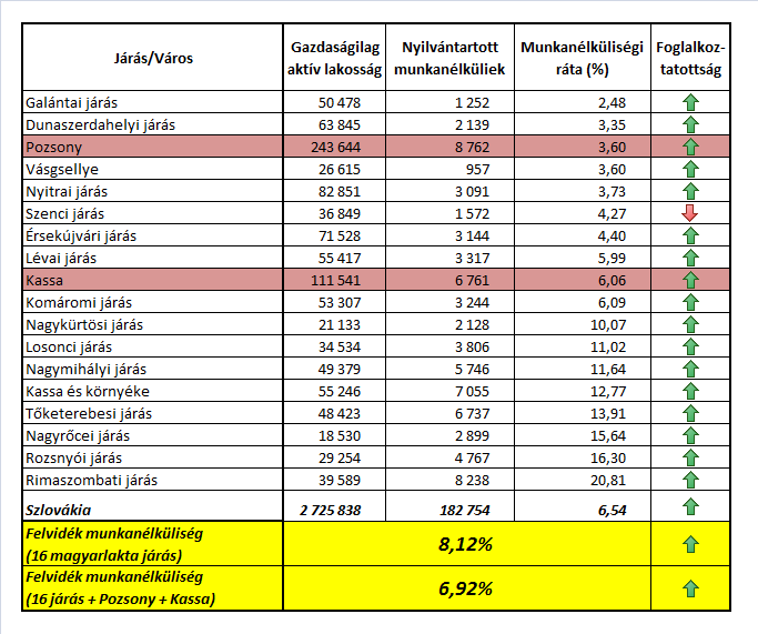A két nagyváros nélkül a felvidéki munkanélküliség 8,12 százalékos, Pozsonnyal és Kassával 6,92 százalékos, fél százalékponttal magasabb, mint az országos átlag. Összehasonlításképp, a nem magyar járások munkanélküliségi rátája 6,47 százalékos, vagyis az országostól jobb.