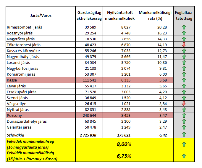 Az országos munkanélküliségi ráta és a magyarlakta régiók rátája hónapok óta alig közelít egymáshoz. Az összes munkanélküli 33 százaléka még mindig a déli járásokból kerül ki. A legnagyobb munkanélküliséggel küzdő 10 járásból négy magyarlakta, ráadásul a leszakadó és a fejlődő régiók közt egyre nagyobb a szakadék.