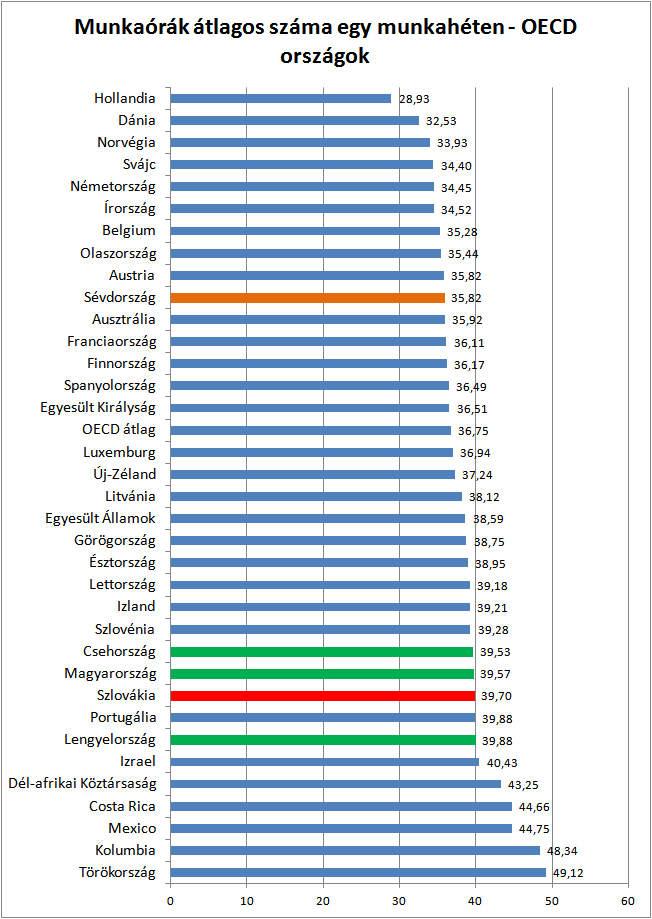 A fenti grafikont az OECD adatai alapján állítottuk össze. Látható, hogy Kelet-Európa országaiban alacsonyabb bérek mellett is jóval több munkaórát dolgoznak az alkalmazottak.