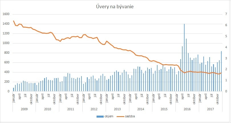 2009-től valamelyest a kamatláb is csökkent. Kilenc éve 14 százalék körül mozogtak a fogyasztási hitelek kamatlábai, tavaly novemberben a Szlovák Nemzeti Bank (NBS) adatai szerint először süllyedt az átlag 8 százalék alá.