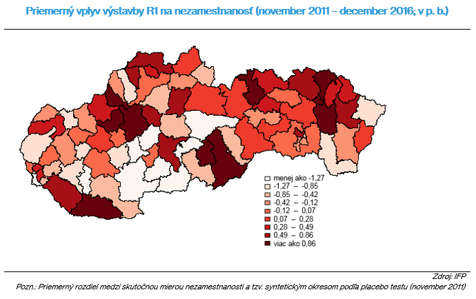 Az IFP ezt az R1-es munkahelyteremtő hatásán keresztül mutatta be. Leginkább az R1-estől délre és keletre mutatkozott meg jótékony hatása. Elsősorban a Galgóci, a Vágsellyei, és Lévai járások profitáltak belőle, ott 0,85-1,27 százalékponttal csökkentette a munkanélküliséget. A R1-es vizsgált szakaszai 2011-ben kerültek átadásra, ekkor a Lévai járásban több mint 9000 munkanélkülit tartottak számon, így a becslés szerint az R1-es több mint 500 munkahelyet teremtett ebben a járásban.