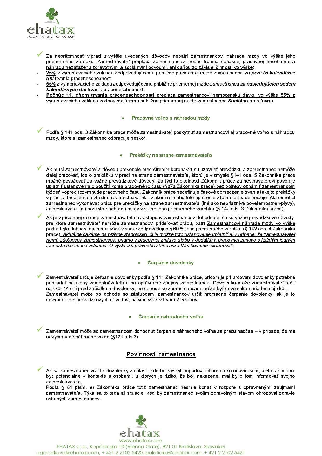 - Ak musí zamestnávateľ z dôvodu prevencie pred šírením koronavírusu uzavrieť prevádzku a zamestnanec nemôže ďalej pracovať, ide o prekážku v práci na strane zamestnávateľa, ktorú je v zmysle §141 ods. 5 Zákonníka práce možné považovať za vážne prevádzkové dôvody. Za týchto okolností Zákonník práce zamestnávateľovi povoľuje uplatniť ustanovenia o použití konta pracovného času (§87a Zákonníka práce) bez potreby oznámiť zamestnancom týždeň vopred rozvrhnutie pracovného času. Zákonník práce nedefinuje časové obmedzenie trvania takejto prekážky