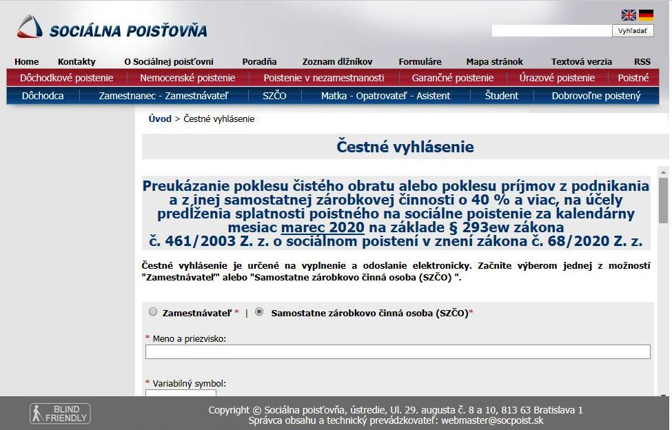 A vállalkozók már kérvényezhetik a Szociális Biztosítóba fizetett havi járulék összegének elhalasztását. Az intézmény már elérhető az ezzel kapcsolatos elektronikus űrlap. Húsvét során ezzel kapcsolatban már mintegy félmillió tájékoztató sms-t és emait küldött szét a Szociális biztosító.