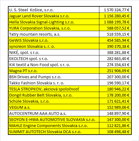 A második helyen a Jaguar Land Rover van 1,16 millió euróval. A márciusi és az áprilisi listán is szerepelnek (mégpedig a top helyeken) a GeWiS Slovakia, a NIKÉ, az EKOLTECH és a Tatry Mountain Resorts. A top 20-as lista alább látható, sárgával jelöltük az autóipari cégeket: