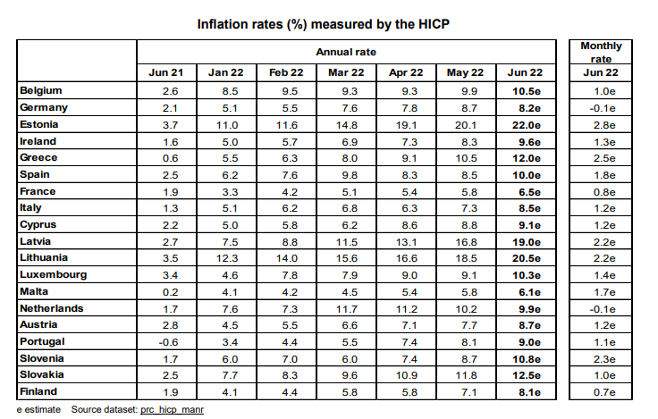 Újabb rekordot döntött az eurozóna inflációja. Az Eurostat adatai szerint a drágulás üteme júniusban 8,6 százalékos volt, szemben a májusi 8,1 százalékos szinttel. Szlovákiában is romlott a helyzet, míg májusban 11,8 százalékos volt az infláció, júniusban már 12,5 százalékos.