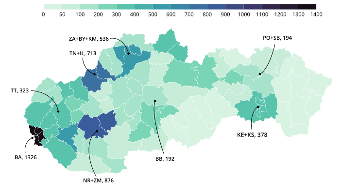A legtöbb menekültet Pozsonyban (1326 fő), a Nyitrai, Aranyosmaróti, Trencséni, Illavai, Zsolnai, Nagybiccsei , Kassa környéki járásokban foglalkoztatják. Az IFP térképe szerint nagy számban találtak munkát a Galántai járásban is: