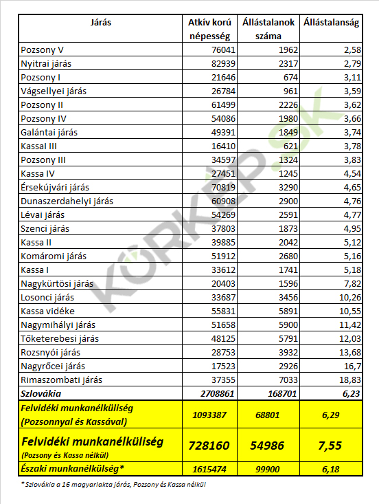 Az adatok viszont most azt mutatják, hogy júniusról júliusra az állástalanok aránya délen 0,19 százalékkal tovább csökkent (1204 fővel kevesebb a munkanélküli, mint egy hónapja), ellenben az északi járások (az ország több 54 járás Pozsony és Kassa nélkül) mutatói befagytak. Sőt, abszolút számokban északon 223 fővel több az állástalan, mint egy hónapja volt.