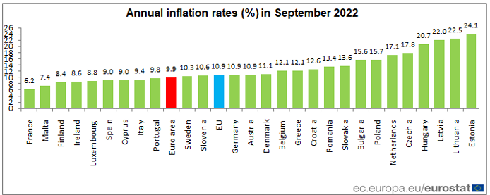 Szeptemberben 9,9 százalékra emelkedett az infláció az euróövezetben az augusztusi 9,1 százalékról, míg a piac a fogyasztói árak 10,0 százalékos éves növekedését várta. Egy évvel korábban, 2021 szeptemberében 3,4 százalék volt az euróövezeti infláció.