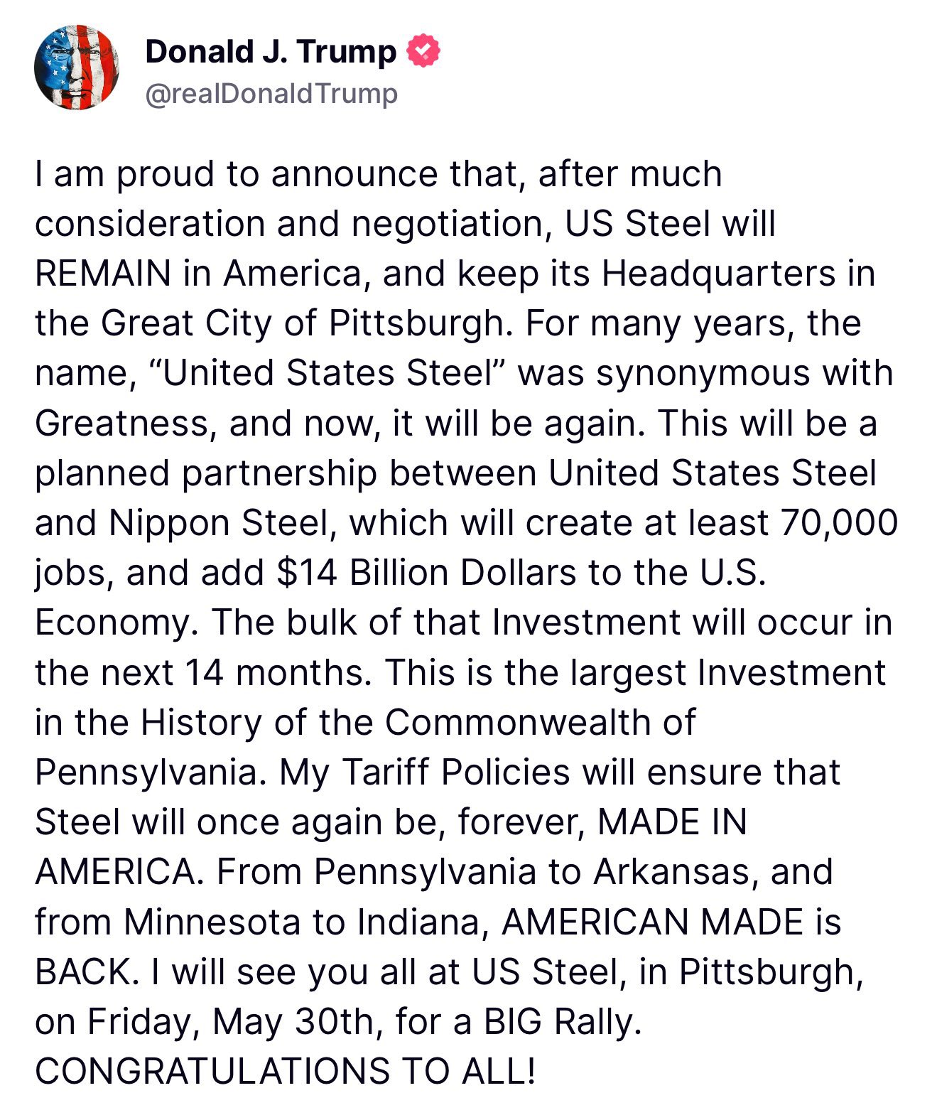 Az amerikai U.S. Steel vállalat egyesülhet japán versenytársával, a Nippon Steellel – jelentette be Donald Trump amerikai elnök. A két acélipari óriás között már korábban is szó volt egy 15 milliárd dolláros felvásárlásról, amelyet előzőleg Joe Biden elnök adminisztrációja blokkolt – jórészt az amerikai szakszervezetek nyomása miatt, amit a 2024-es elnökválasztási kampány miatt volt kénytelen figyelembe venni. Hozzátesszük, hogy korábban Trump is kritikusan nyilatkozott a fúzióról, de szinte nyílt titok volt, hogy az úgyis megvalósulhat az elnökválasztást követően. Így is lett, igaz, több mint fél évet kellett rá várni.
