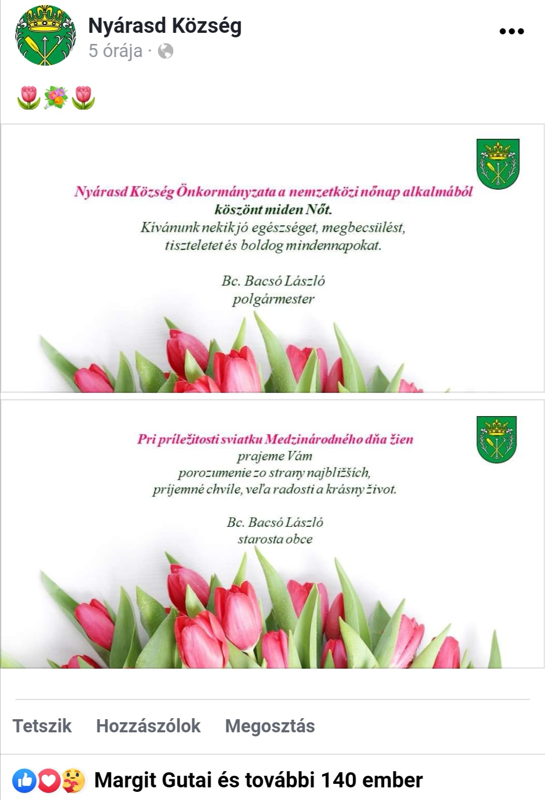 Bacsó László, Nyárasd község polgármesterének kezdeményezésére a felvidéki polgármesterek körében is egyre népszerűbb a felköszöntés. A felvidéki települések között elsőként Nyárasd közég közösségi oldalán jelent meg az ezzel kapcsolatos tartalom. Az önkormányzatok többsége amellett, hogy személyesen is felköszöntötte a hölgyeket, nem feledkezett meg a polgárokról sem.