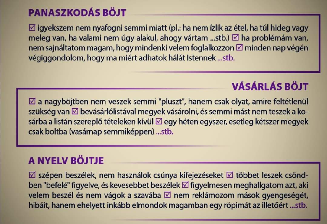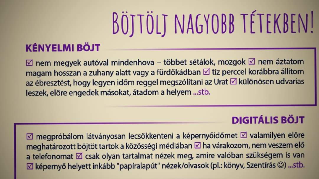 A tévhittel ellentétben a böjtölés nem az önsanyargatást, szenvedést jelenti. Hiszen a szent 40 nap valójában a valami(k)ről való lemondásról szól. Ez lehet akár a hústilalom betartása, de az adott személy a saját maga életére is „rávetítheti” a böjtöt. Dönthet arról, hogy miképp gyakorol önmegtartóztatást a húsvét előtti hetekben. Lemondhat akár a csokoládé/szeszes italok fogyasztásáról, a vigadozásról, vagy épp az internetezésről.