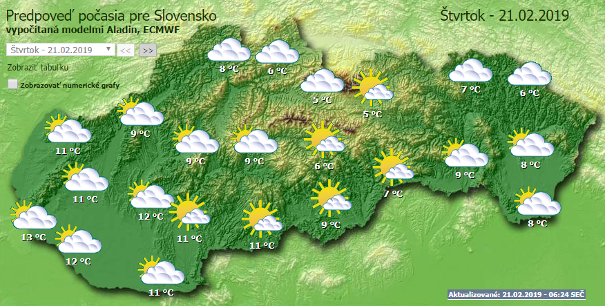 Csütörtökön is marad a változóan felhős égbolt. Északnyugat felől fokozatosan megnövekszik a felhőzet, így a délutáni órákban elszórtan esőre, míg 900 méteres magasságtól havazásra lehet számítani. A legmagasabb nappali hőmérséklet 8 és 13 Celsius-fok között alakul. Kiszucán, Árván, Liptón és Szepes északi részén 6 fok lesz. Az ország nyugati részén 20 km/órás nyugati, illetve északnyugati szél fog fújni.