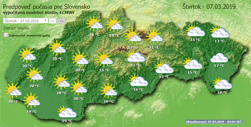 Borús, felhős idővel indul a csütörtök, kora estére pedig a csapadék is megérkezhet. Szeles, de meleg idő lesz, a legmagasabb nappali hőmérséklet 16 és 21 Celsius-fok között alakul. Árván, Liptón, Felső-Garam mentén és az ország északkeleti részén 12 és 16 Celsius-fokot mérhetünk. Erős déli szél fog fújni, ami délnyugaton a 45–70 km/órás széllökéseket is elérheti. A hegyekben viharos időjárásra lehet számítani.
