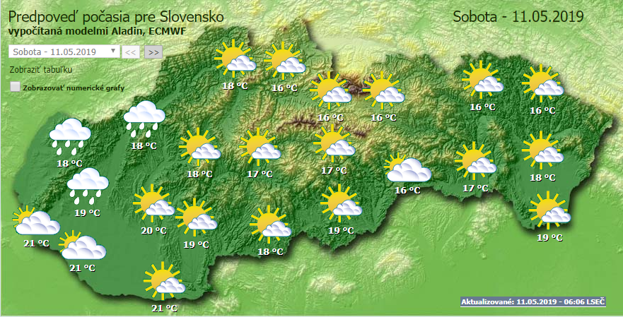 Délelőtt sok napsütés várható, majd délután nyugat felől fokozatosan megnövekszik a felhőzet. Eső, zápor csak az esti óráktól alakulhat ki. A legmagasabb nappali hőmérséklet 18 és 23 Celsius-fok között alakul, míg Árván és a Tátra alatt 16 fok lesz. A hegyekben, 1500 méteres magasságban 8 Celsius-fokot mérhetünk. A délkeleti-déli szél az ország délnyugati részén fokozatosan megerősödik (20 km/h).