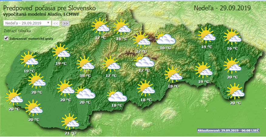 A legmagasabb nappali hőmérséklet 19 és 24 fok között alakul, míg Kiszucán, Árván, Liptón és Szepesben 17 Celsius-fok lesz. 5–30 km/órás délnyugati szél fog fújni.
