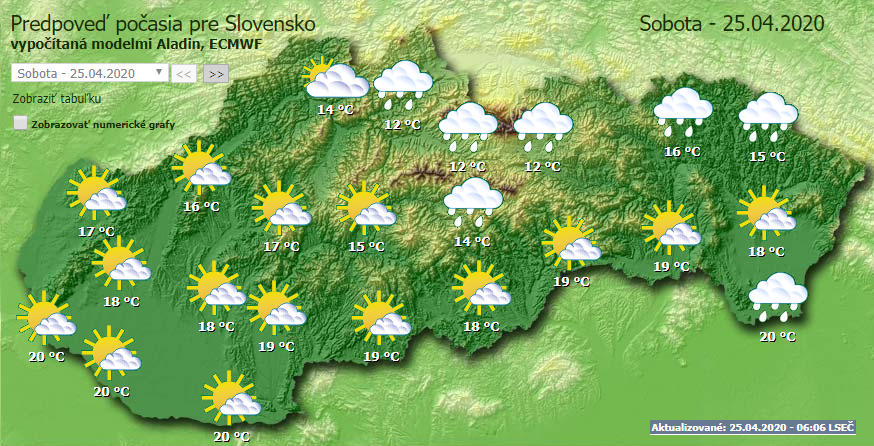 Változékony, felhős időre számíthatunk szombaton. Záporok, illetve viharok elsősorban a Zsolnai kerületben és az ország keleti részén alakulhatnak ki. Helyenként jégesővel kísért viharok is előfordulhatnak.