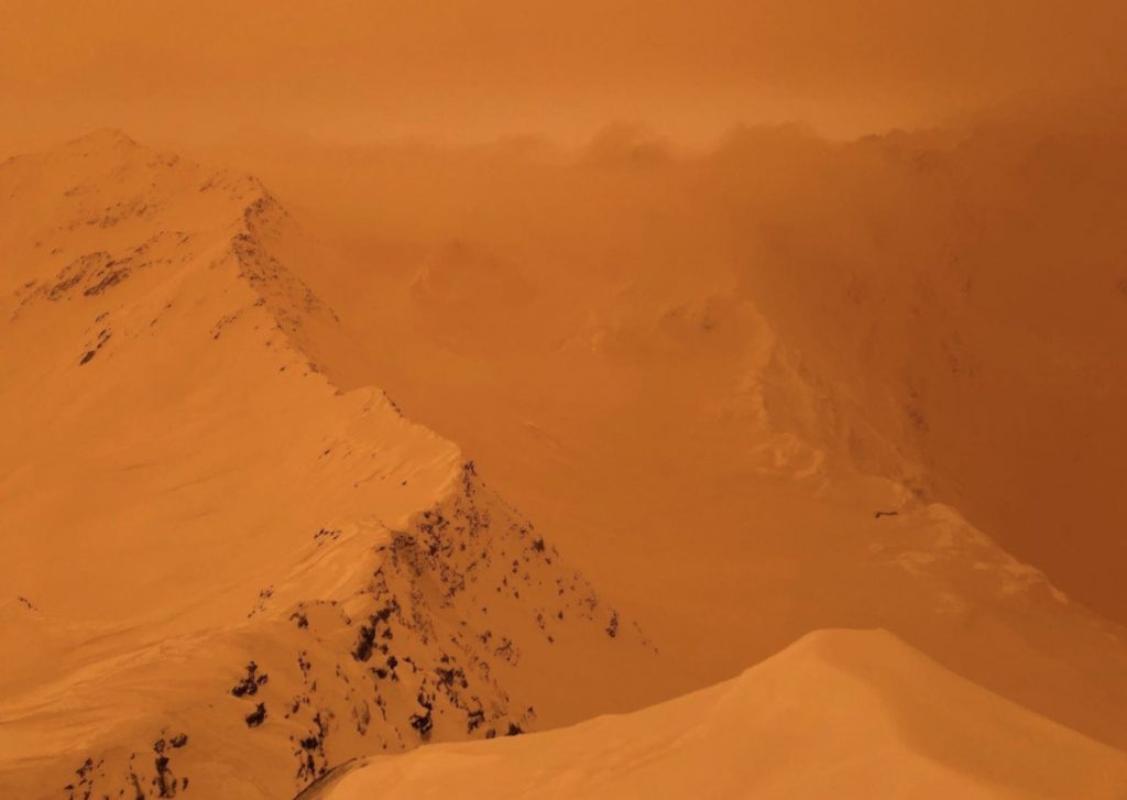 A Mont Blanc régió Chamonix-völgyben narancssárga árnyalatot is látni lehetett, amikor a levegőt a Szaharából származó homokpor megtöltötte.