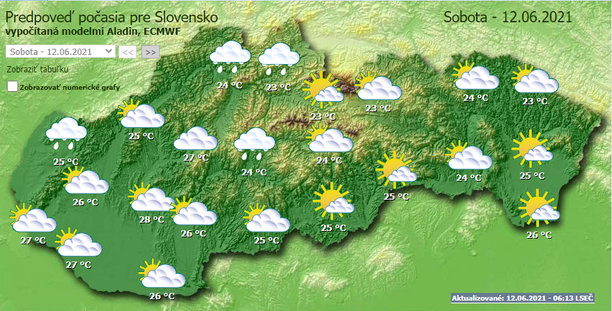 A legmagasabb nappali hőmérséklet 25 és 30 fok között alakul, Zsolna megyében és Felső-Szepesben 23 fokot mérhetünk. 5–25 km/órás nyugati szél várható, amely a hegyekben viharossá fokozódhat.