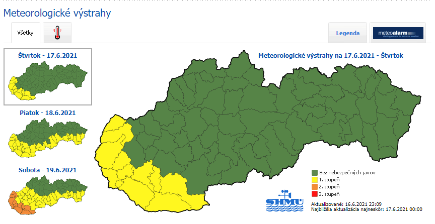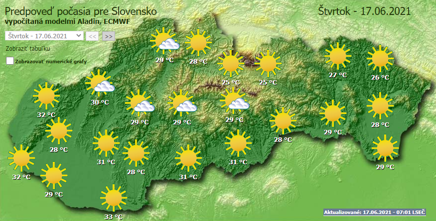 Túlnyomóan napos időre számíthatunk, néhol átmenetileg megnövekedhet a felhőzet. Nagyon meleg lesz, a Szlovák Hidrometeorológiai Intézet délután 14.00 órától 17.00 óráig elsőfokú riasztást adott ki Pozsony, Nyitra és Nagyszombat megyére.