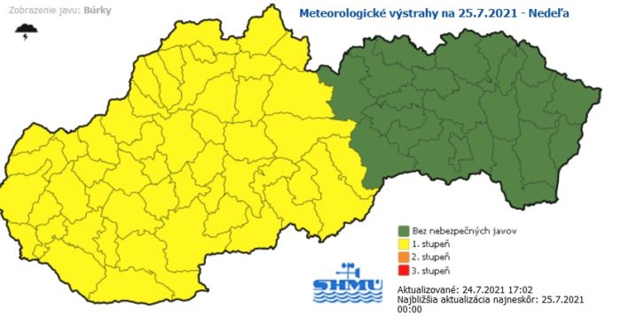 Viharokra kell számítani Szlovákia hat megyéjében, ezért a Szlovák Hidrometeorológiai Intézet elsőfokú figyelmeztetést adott ki vasárnap délutánra. A riasztás vasárnap este 18 órától másnap reggeli 6 óráig érvényes Pozsony, Besztercebány, Trencsén, Nyitra, Nagyszombat, valamint Zsolna megyében.