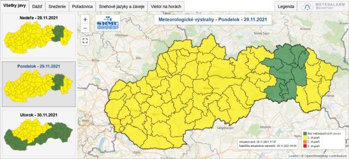 Vasárnap estétől hétfő kora reggelig Szlovákia valamennyi megyéjében esőre és nedves, csúszós utakra kell számítani, ezért a Szlovák Hidrometeorológiai Intézet (SHMÚ) elsőfokú riasztást adott ki vasárnap 20 órától egészen hétfő 9 óráig.