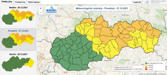 Vasárnapról hétfőre virradóra jelentős hőmérsékletcsökkenés várható Szlovákia középső és keleti, valamint leginkább északi területein, ezért a Szlovák Hidrometeorológiai Intézet (SHMÚ) másodfokú riasztást adott ki az ország öt megyéjére vasárnap este 18, illetve 19 órától kezdve.