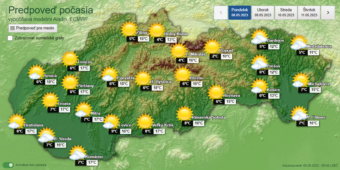 A legmagasabb nappali hőmérséklet 15 és 21 fok között alakul, míg Észak- és Kelet-Szlovákiában 9 és 15 fok lesz. Megerősödik az északkeleti szél, eleinte 30–45 km/órás, majd 60 km/órás széllökésekkel.