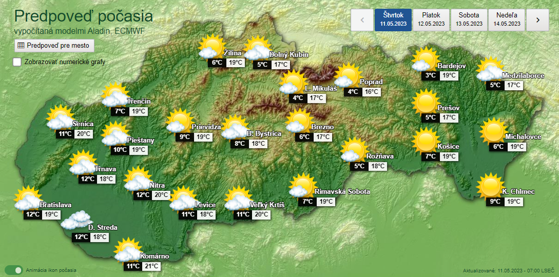 A legmagasabb nappali hőmérséklet 18 és 23 fok között alakul, míg Árván és a Tátra alatti vidéken 16 fok lesz. Megerősödik a keleti, délkeleti szél (10–30 km/óra), délnyugaton a széllökések ereje elérheti a 45 km/órát.