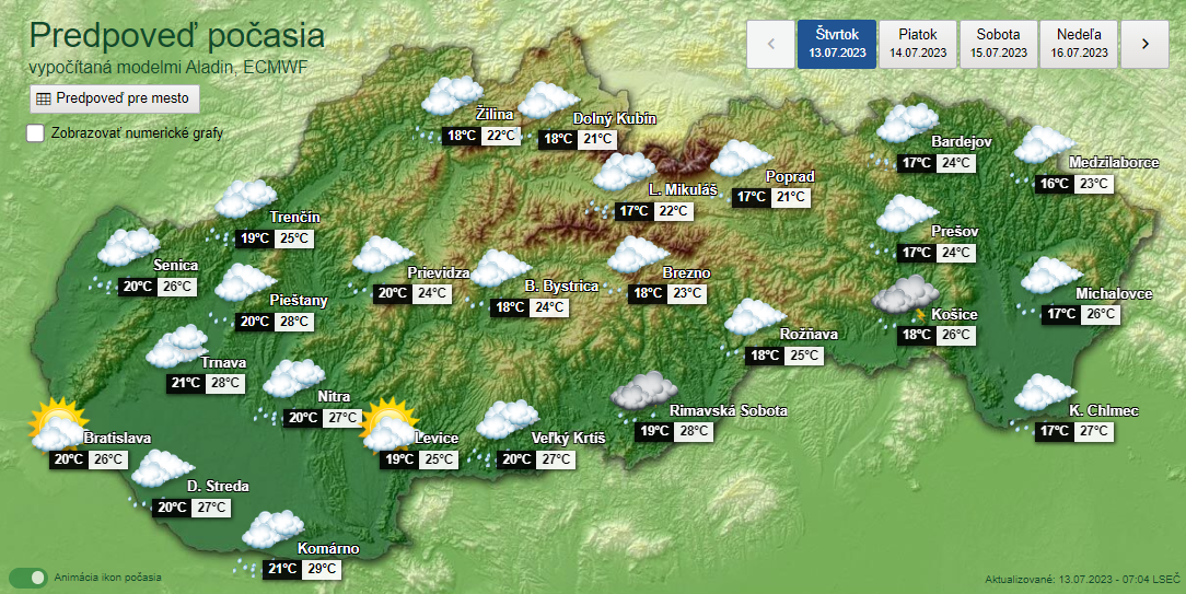 Továbbra is marad a fülledtség. A legmagasabb nappali hőmérséklet 24 és 29 fok között alakul, míg Zsolna megyében és Felső-Szepesben 22 fok lesz. A nap folyamán nyugat felől megélénkül az északnyugati szél (10–25 km/óra).