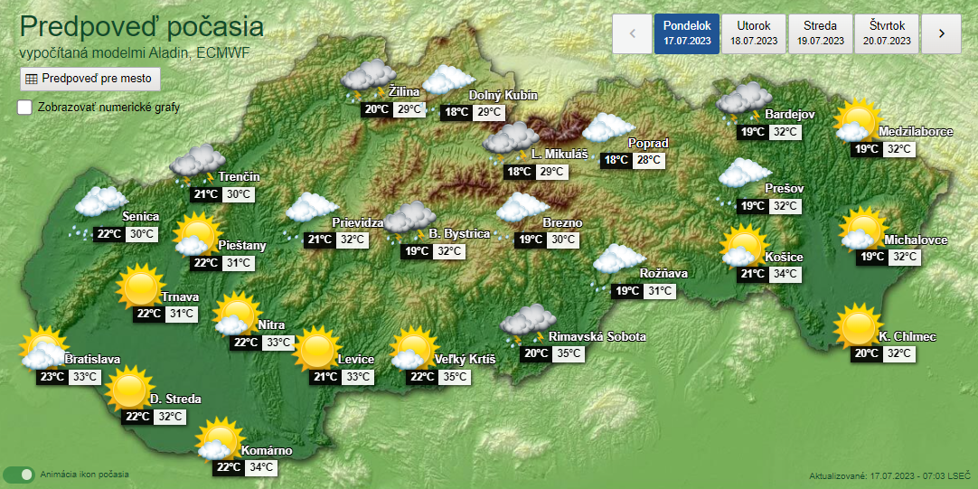 Továbbra is marad a fülledt meleg, a legmagasabb nappali hőmérséklet 30 és 35 fok között alakul, még Trencsén és Zsolna megyében, a Felső-Garam mentén és az ország északkeleti részén 25–30 fokot mérhetünk. Helyeként megerősödik az északnyugati-északi szél (20 km/óra).