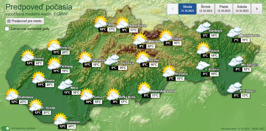 A legmagasabb nappali hőmérséklet 19 és 25 fok között alakul, míg Besztercebánya megyében és Kelet-Szlovákiában 12–18 fokot mérhetünk. Déli szél fog fújni (5–25 km/óra).
