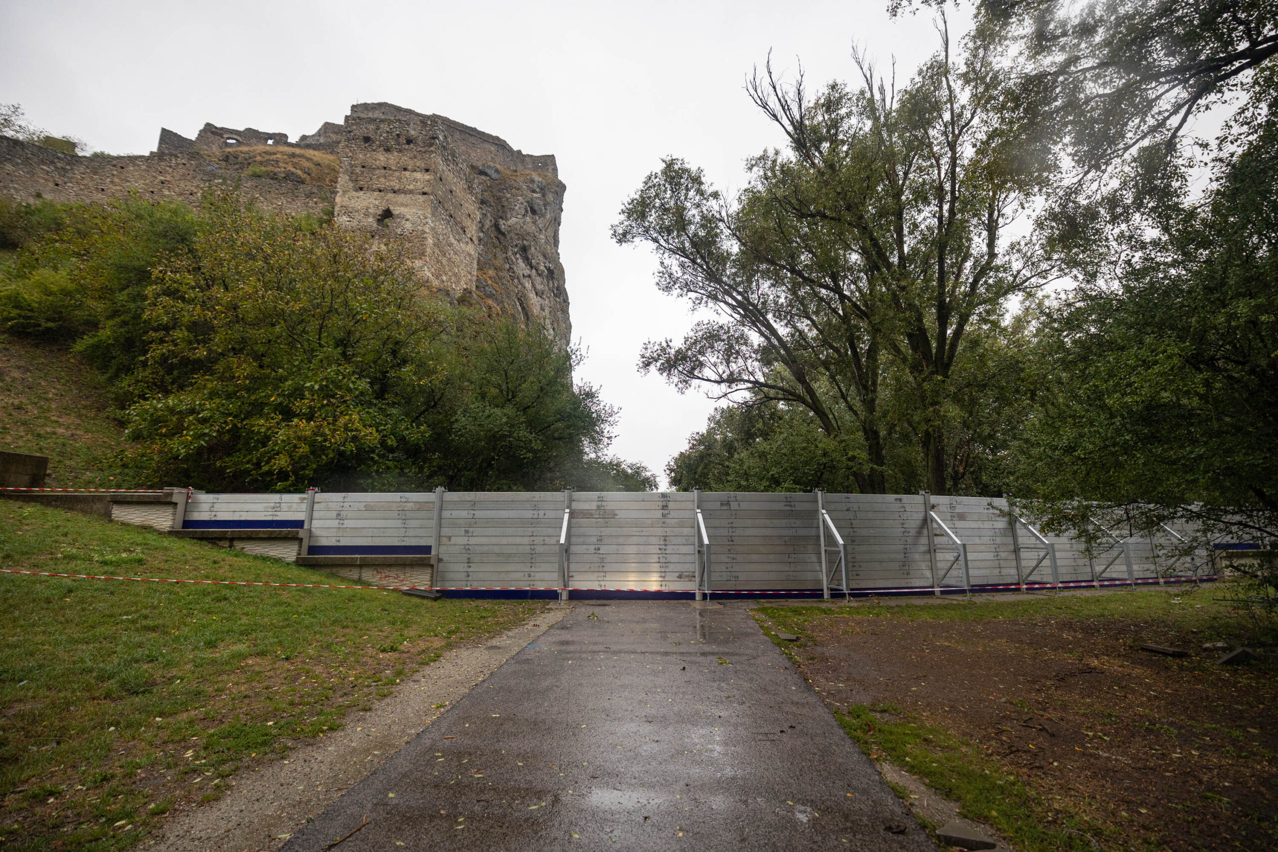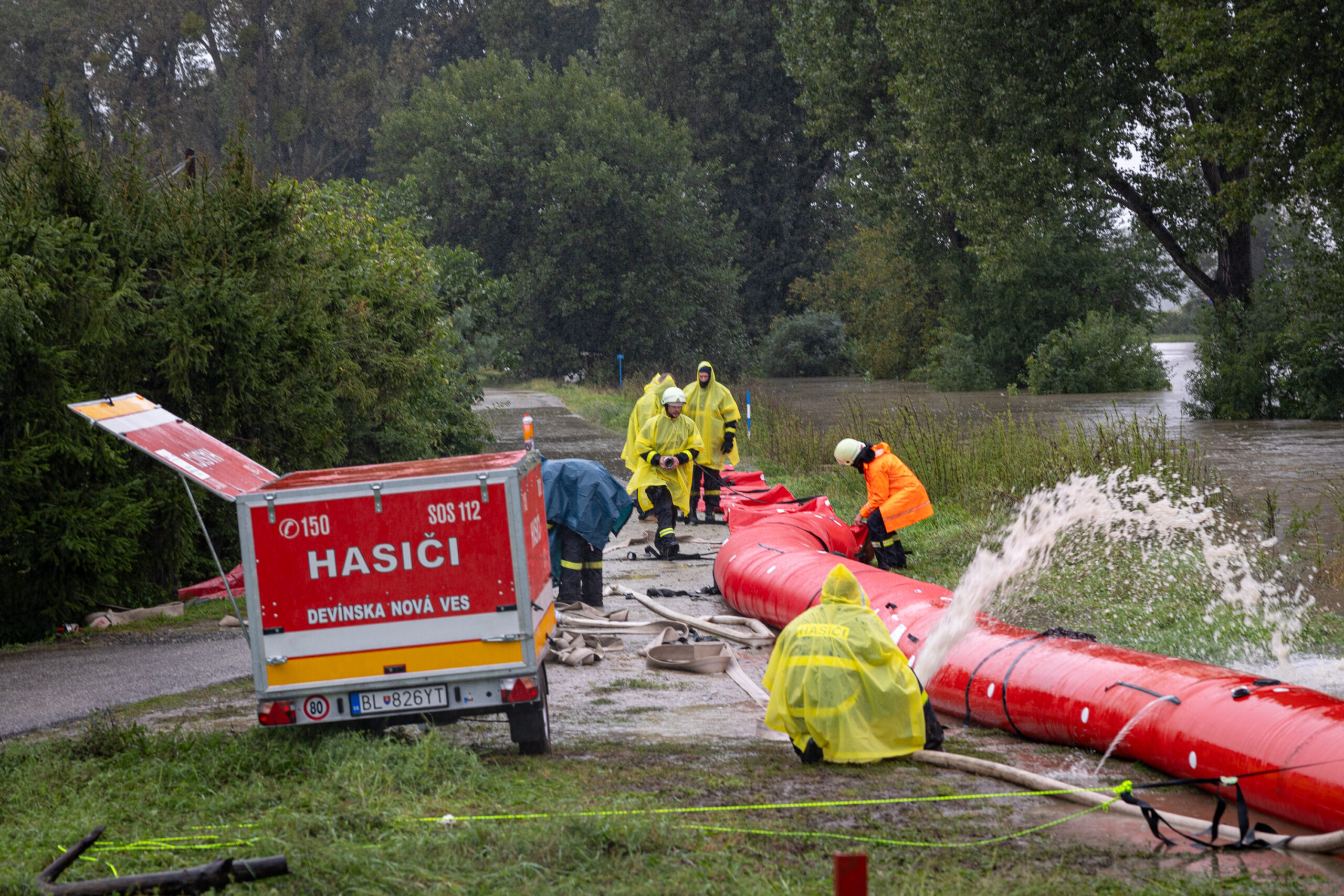 Protipovodňové mobilné zábrany v bratislavskej mestskej časti Devín počas dní kedy Slovenský hydrometeorologický ústav vydal 2. a 3. stupeň meteorologickej a hydrologickej výstrahy pre západné Slovensko. Bratislava, 14. september 2024. Foto: SITA/Jana Birošová