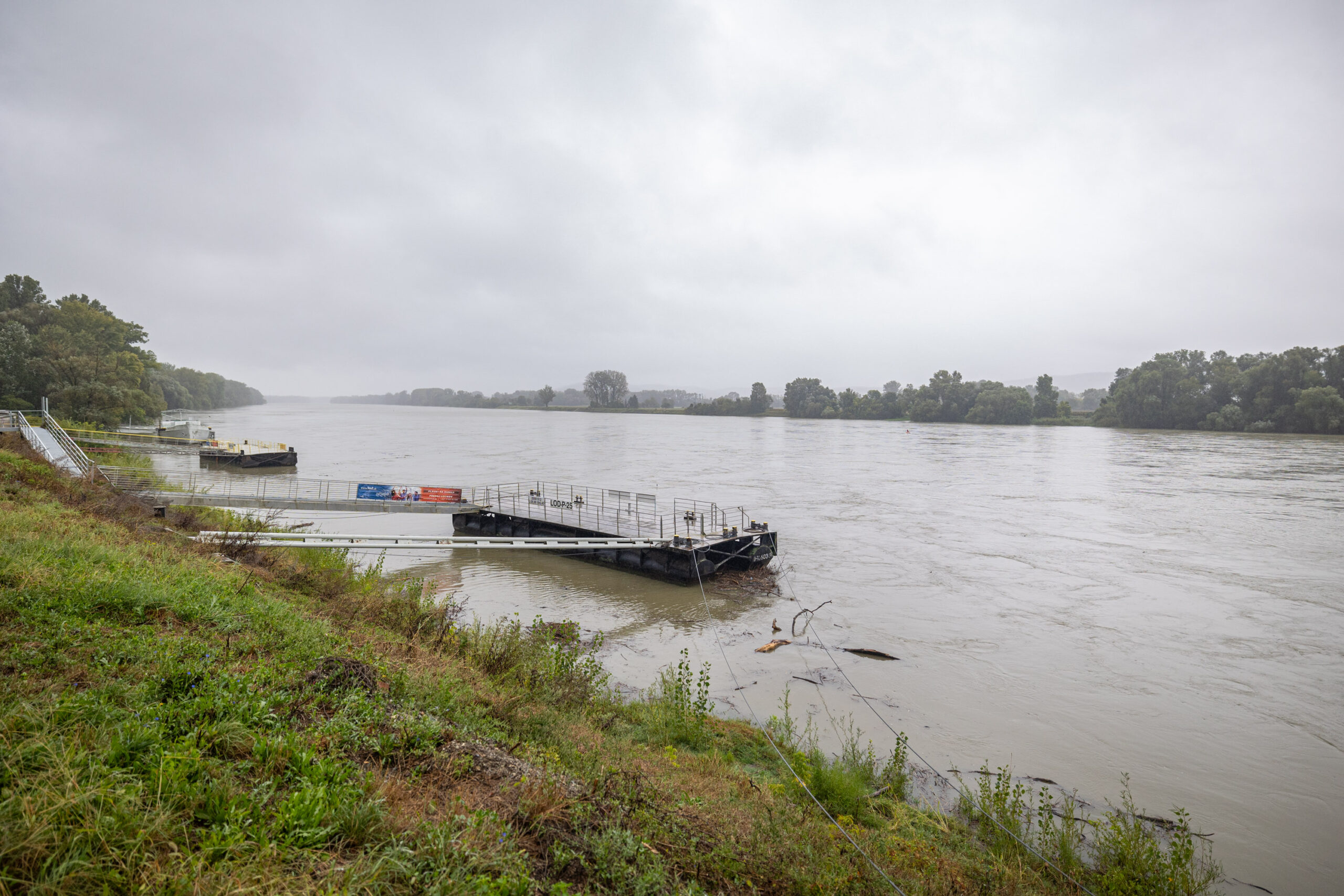 Zvýšená hladina Dunaja v bratislavskej mestskej časti Devín počas dní kedy Slovenský hydrometeorologický ústav vydal 2. a 3. stupeň meteorologickej a hydrologickej výstrahy pre západné Slovensko. Bratislava, 14. september 2024. Foto: SITA/Jana Birošová