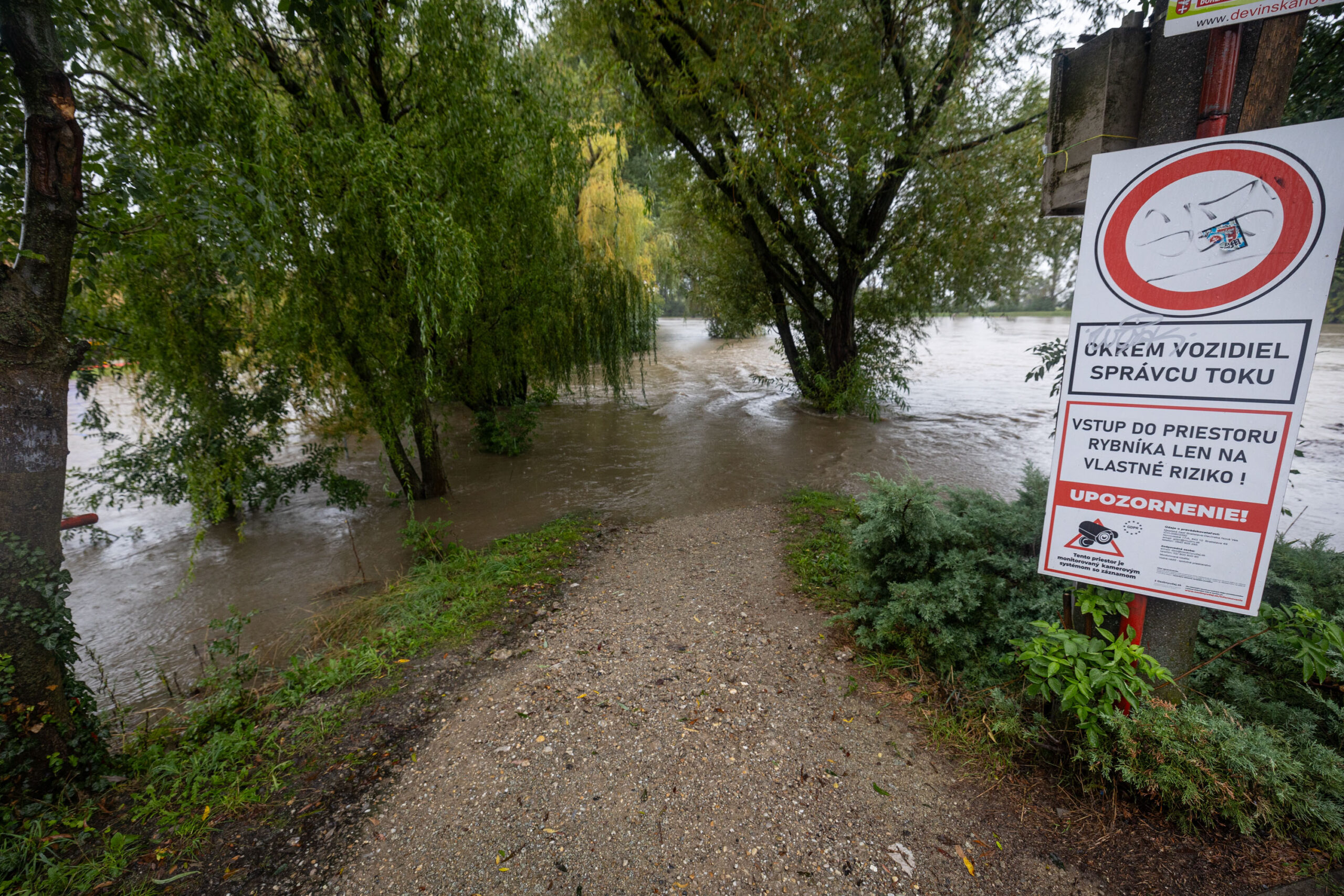 Aktuálna situácia pri Devínskom jazere v bratislavskej mestskej časti Devínska Nová Ves počas dní kedy Slovenský hydrometeorologický ústav vydal 2. a 3. stupeň meteorologickej a hydrologickej výstrahy pre západné Slovensko. Bratislava, 15. september 2024. Foto: SITA/Jana Birošová