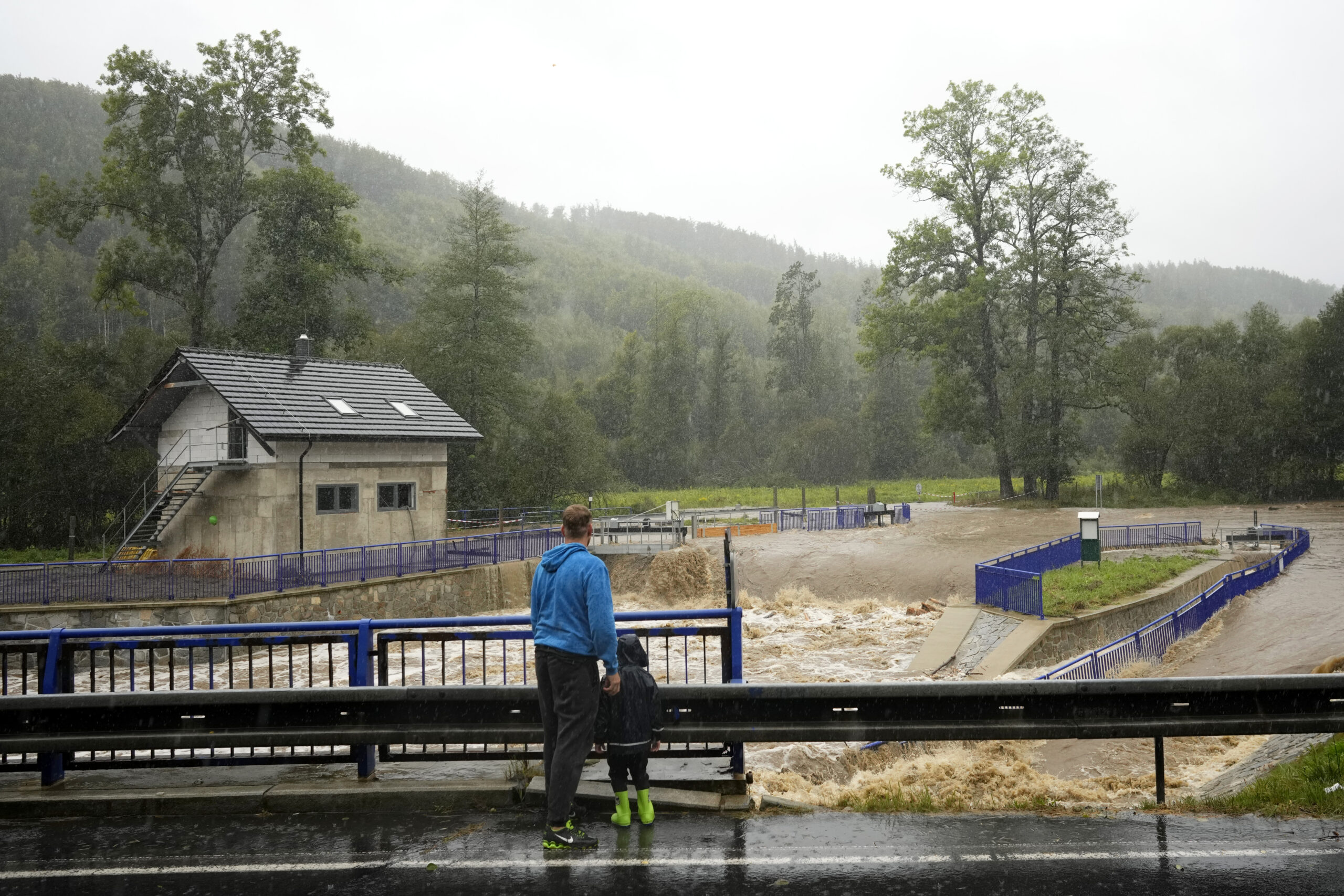 Residents watch the rising levels of the Opava river near Brantice, Czech Republic, Saturday, Sept. 14, 2024. (AP Photo/Petr David Josek)