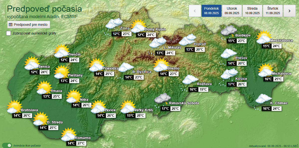 Változóan felhős-napos idővel indul a munkahét. Szlovákia középső és keleti részén fokozatosan megnövekszik a felhőzet, sőt időnként erősen felhős lesz az ég, és sok helyen várhatók záporok. Helyenként zivatarok is előfordulnak, amelyek intenzívek is lehetnek. Nyugaton csak elszórtan várható csapadék. Reggel helyenként köd vagy alacsony felhőzet is kialakulhat.